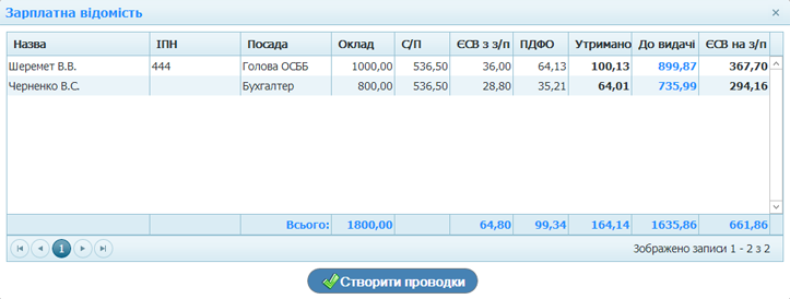 В Зарплатній відоості програма автоматично розрахує суми єдиного соціального внеску та податку з доходів фізичних осіб, залишиться лише натиснути кнопку для формування відповідних проводок: