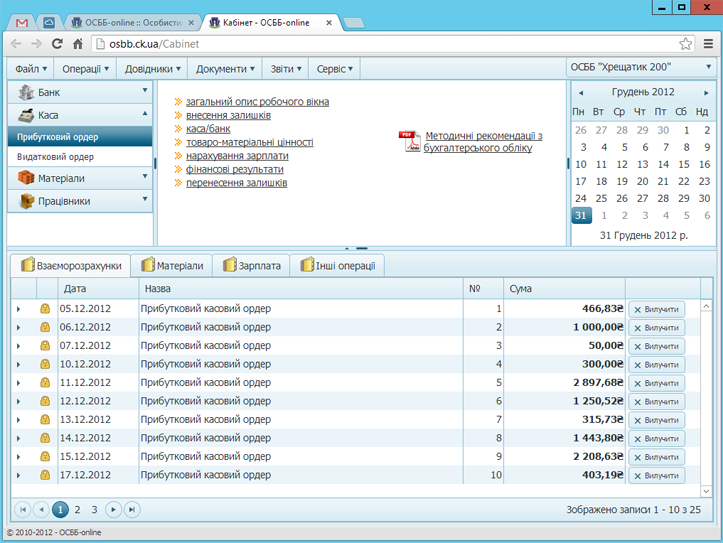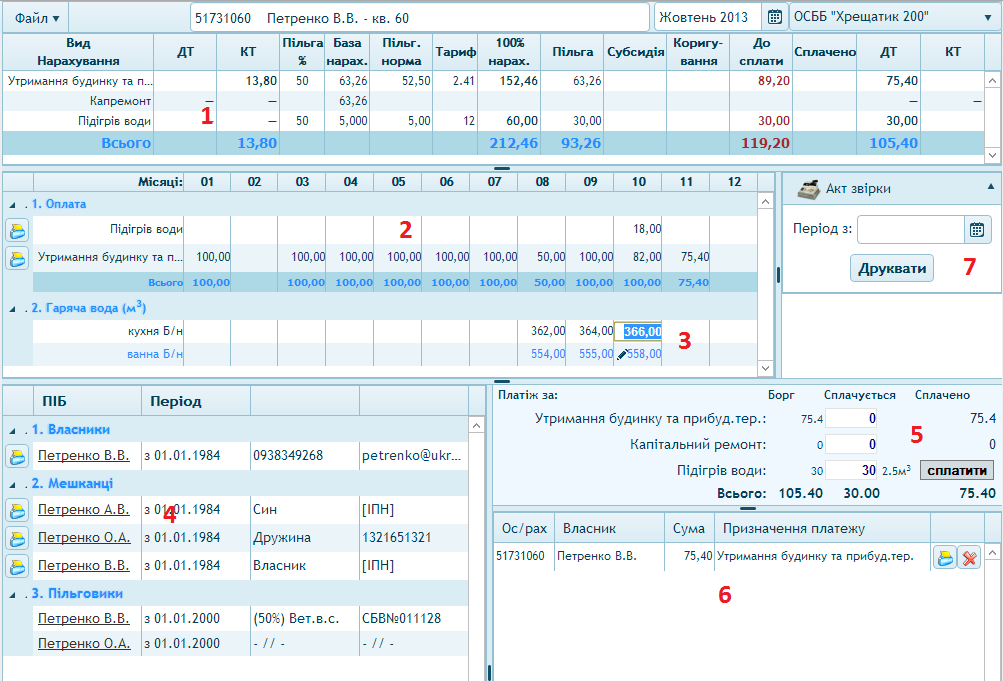Дане вікно зручно використовувати у випадках, коли необхідно з'ясувати питання по нарахуванням та оплатам; виписати квитанцію; внести оплату; роздрукувати прибутковий касовий ордер, маючи перед собою на екрані (на зображенні виділено червоними цифрами): - Скомбіновану відомість всіх видів нарахувань по особовому рахунку за вибраний місяць (на зображенні Жовтень 2013р);