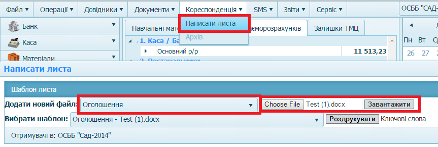 Після цього документ необхідно завантажити в програму: розділ "Видатки", меню "Кореспонденція" - Написати листа.