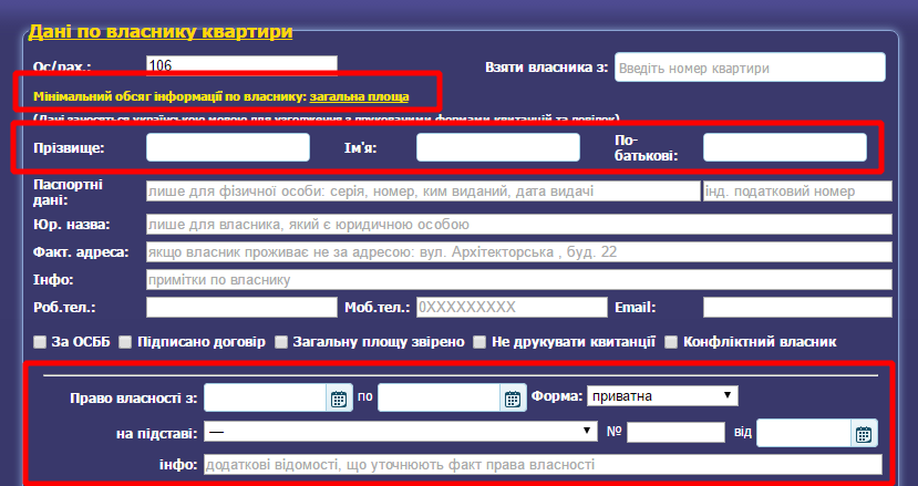 - якщо ОСББ вже створене, і необхідно розпочати ведення обліку, то мінімальний обсяг - загальна площа приміщення. - якщо йде підготовка до проведення установчих зборів, то необхідно внести інформацію не тільки по власниках, але й співвласниках (ПІБ, та дані про документ, що підтверджує право власності). |