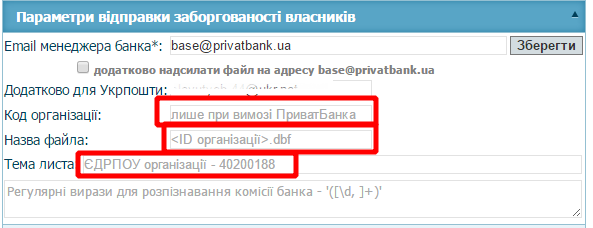 Останній лист, який ПриватБанк розсилав своїм клієнтам: Уважаемый клиент! ________________________________________ ID підприємства - видає менеджер ПриватБанка Тему листа та ім'я фала прописуєте Ви. Код Організації Ви НЕ заповнюєте окрім випадку, коли цього вимагає Ваш консультант. ОСББ-online генерує файл у форматі DBF та відправляє на вказаний Вами E-mail та додатково на base@privatbank.ua, якщо проставлена відповідна галочка
