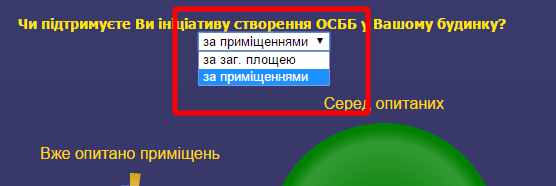 Справа в тому, що ми додали можливість перегляду результатів в залежності від квадратних метрів загальної площі (вибирається по замовчуванню, т.я. за законом для створення ОСББ необхідно рахувати метри). У Вашому будинку в приміщеннях не вказано метраж, тому і діаграма порожня. Зараз вже адаптували логіку так, що, якщо не вказано в жодному приміщенні загальну площу, то по замовчуванню показувати "за приміщеннями"