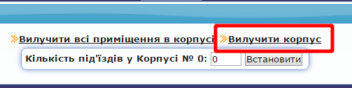 Доброго дня. Щоб корпус став доступним для видалення необхідно спочатку видалити всі особові рахунки до приміщень 0-го корпусу (Особистий кабінет - Реєстр особових рахунків).